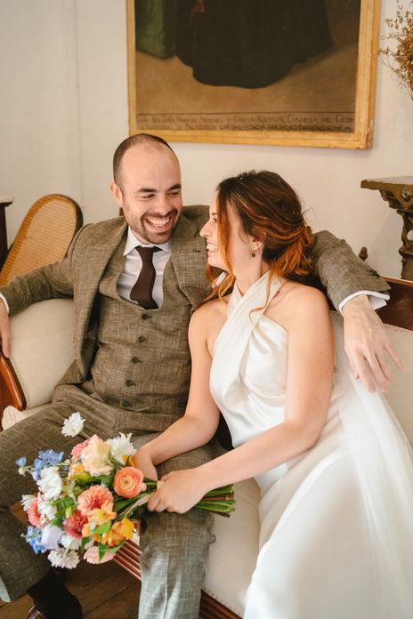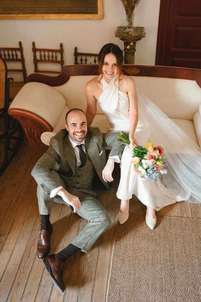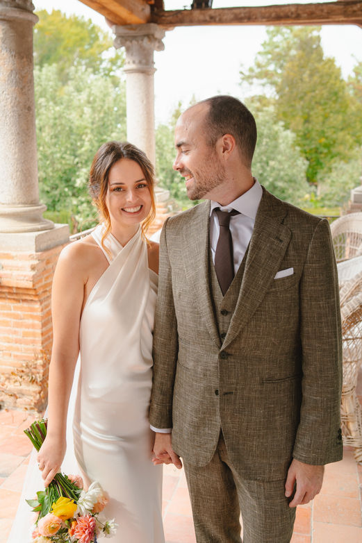 Sonia, radiante y serena, eligió un vestido de Sedka Novias que reflejaba su estilo elegante y sencillo, pero con un toque de sofisticación. El vestido realzaba su belleza natural y se complementaba perfectamente con el ramo de El Espino Flores, que aportó un toque de frescura y color. Su peinado, realizado por Susana García Estilistas, y los zapatos de Salo Madrid fueron el toque final que hizo que Sonia se sintiera completamente ella misma, deslumbrante pero con un aire relajado, ideal para el ambiente desenfadado y acogedor de la celebración.