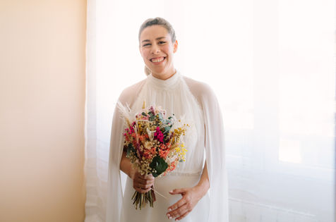 Alicia deslumbró con un diseño de Brea Official, un vestido con presencia y delicadeza a partes iguales. Completó su look con unos zapatos de Inés Domecq Shoes y un ramo de @trencadissafloral, fresco y lleno de matices. El maquillaje, realizado por Amparo Sánchez M., potenciaba la luz natural del rostro con un acabado limpio y sofisticado.